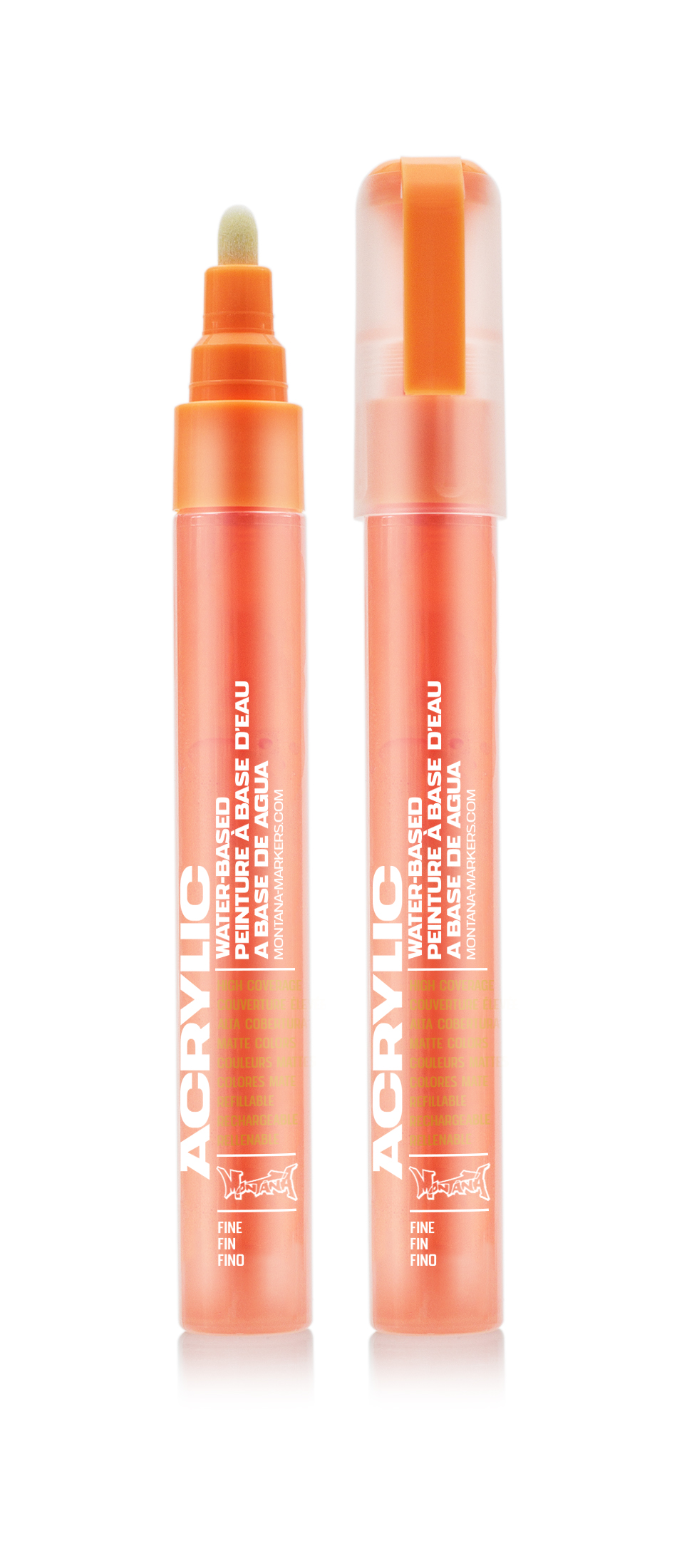 The Montana ACRYLIC marker can be used on many different surfaces and is ideal for fine, controlled and precise detail work. The robust, specially manufactured plastic tip offers the advantage of a fiber tip (drying-resistant) and the accuracy of a sketch marker. The optimized pump valve system of the pens ensures optimal ink flow, and the transparent cover makes it easy to determine the remaining ink level. Additional tips for changing, even while working, are available separately. The Montana ACRYLIC marker is also available as a fillable empty marker to create your own individual color tones.